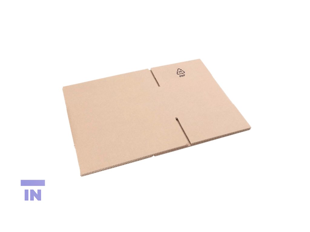 Materiál je ze 100 % recyklovaného testlineru, čímž podporuje ekologické a cenově efektivní balení. Potisk je minimální — pouze recyklační značka „PAP 20“, bez QR kódů, což přispívá k jednoduchému a čitelnému provedení.