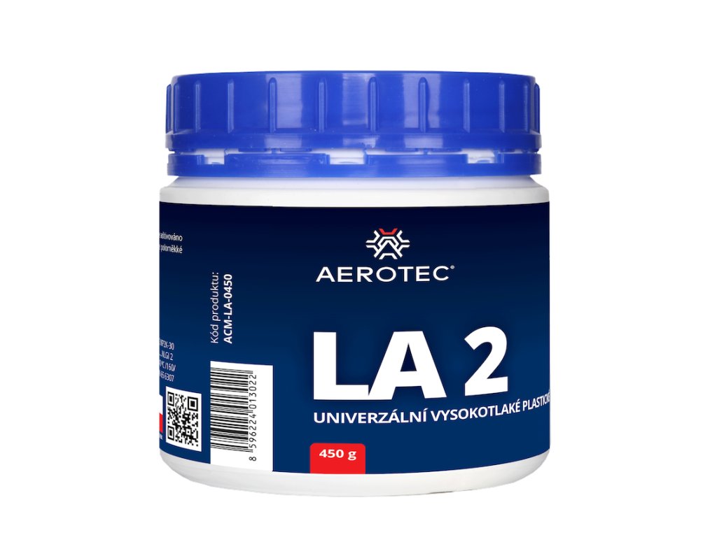 AEROTEC® LA2 je univerzální mazivo poloměkké konzistence, hnědé barvy. Obsahuje vysokotlaké přísady EP, je odolné vůči vodě a pro zpevnění směsi je využíváno lithné mýdlo. Plastické mazivo je obohaceno o aktivní AEROTEC® Metal Conditioner, který během působení třecích sil vytváří ochranný nanofilm, který významně snižuje tření a zároveň odolává vysokým teplotám a tlakům.
