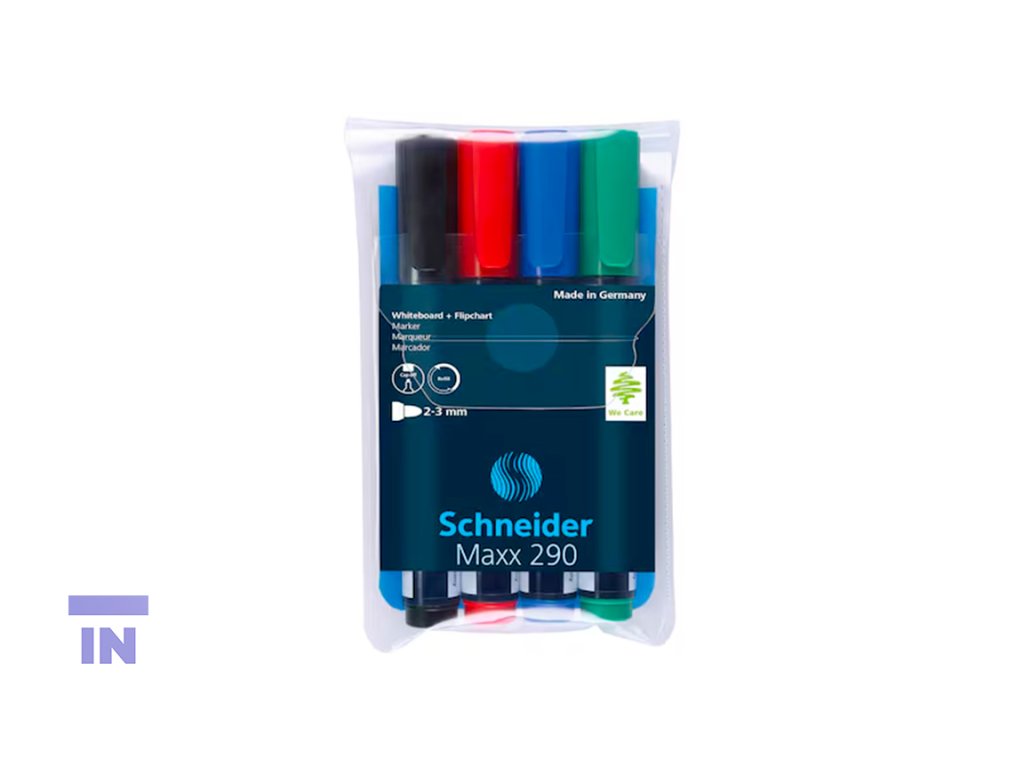 Popisovače Schneider jsou určeny pro psaní na bílé tabule i flipcharty a umožňují snadnou vizualizaci nápadů, prezentací či poznámek ve škole, kanceláři nebo při školeních. Sada obsahuje čtyři základní barvy – černou, červenou, modrou a zelenou – které usnadní rozlišení jednotlivých témat a zvýší přehlednost zápisů.